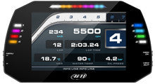 The largest display in the AiM TFT color line, the MXG offers a very large 7" display, With 8 fully colored LED alarm lights, up to 8 analog inputs native, 2 external CAN connections, and more, you will never outgrow this dash/logger. And don't forget the dual backup camera inputs!