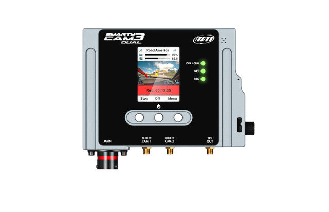 How do we explain the flagship SHCD 3 Dual? The most advanced SmartyCam made, it features dual 1920 x 1080 video at up to 60 fps through the optional 67, 84, or 120 degree lenses of the bullet cameras. The video overlay and Picture in Picture is processed real time and written to the full size SD card (up to 2 TB) and internal 64 GB SSD if equpped. Connection to AiM devices is easily handled through the 5 pin 712 Binder cable, but the internal ECU bridge make connection directly to the car's ECU or other data systems a simple 2 wire connection. With the ability to bring in external audio and have an ethernet connection, the SCHD 3 Dual is a powerhouse.